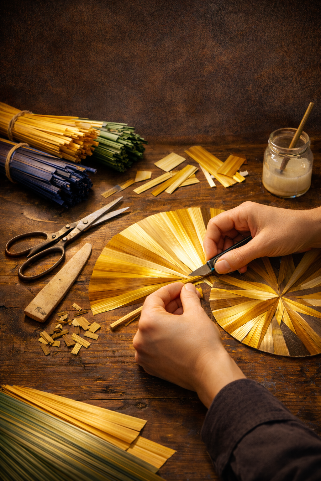 Souple et résistante à la fois, elle se prête à un travail délicat où chaque brin est fendu, aplati et posé un à un à la main.